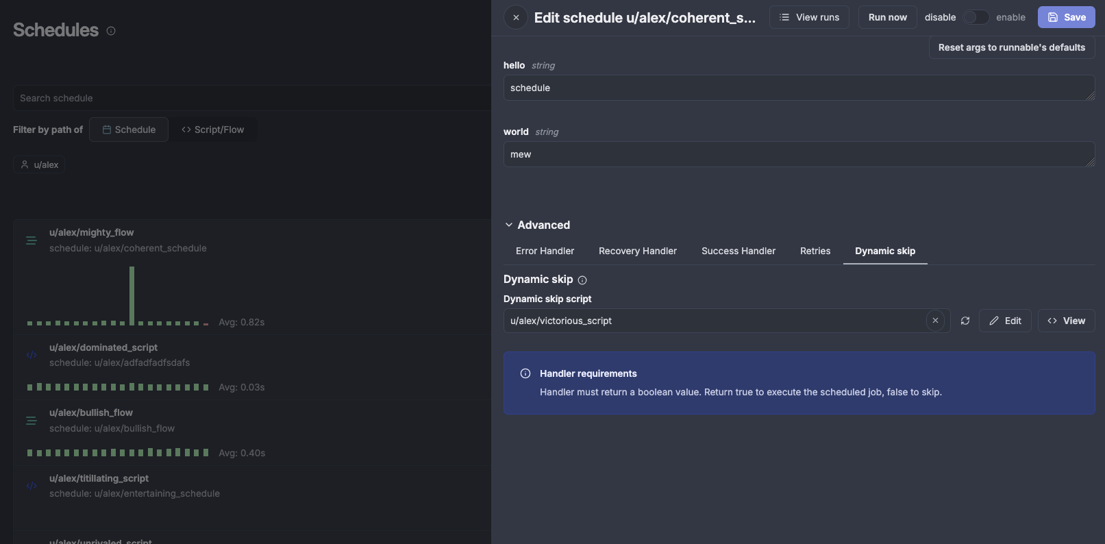 Schedules can now use validation scripts to dynamically determine if scheduled jobs should run or be skipped until the next tick, enabling scriptable custom conditions beyond standard cron expressions.